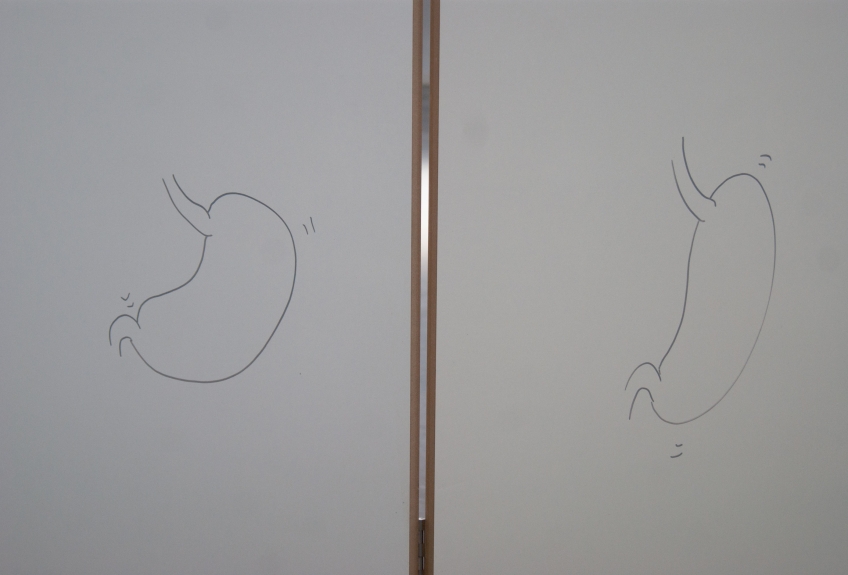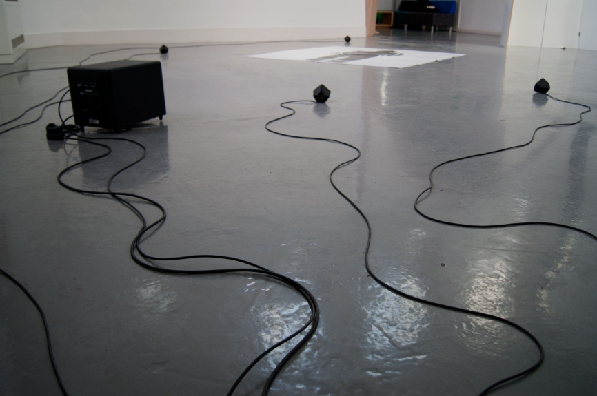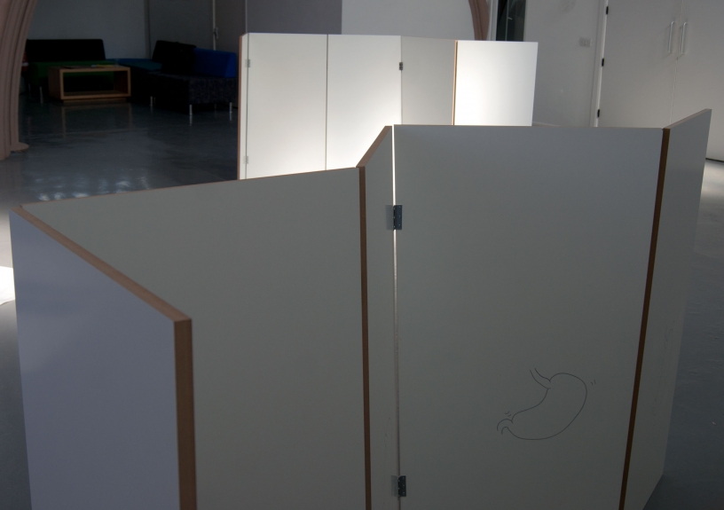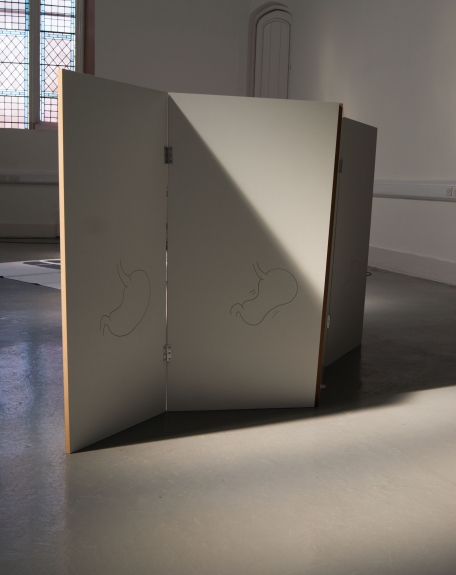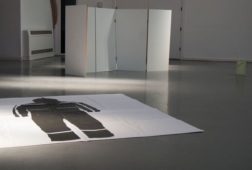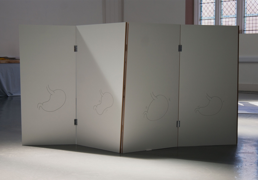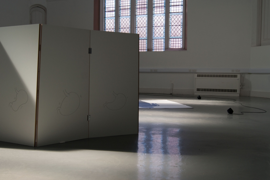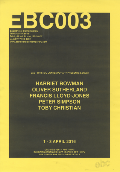 for ebc003 artists harriet bowman and oliver sutherland (bristol) were invited to take a lead on the exhibition. they elected to invite fellow artists; francis, peter, and toby to join the exhibition. ebc003 featured a screen and text devised by harriet, a movement responsive sound work by oliver, a printed image of a protective suit by francis and peter, and pulped sculptures by toby. as part of the exhibition programme, breakfast was served in the gallery by harriet and oliver, including fresh coffee and egg baps. in addition, ebc hosted a skype conversation with ebc instagram resident sarah roberts.