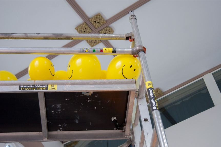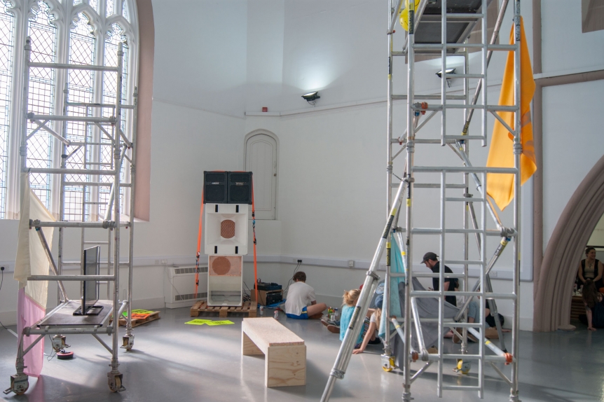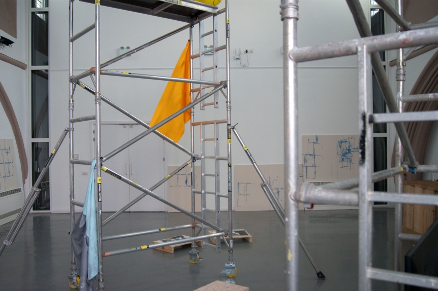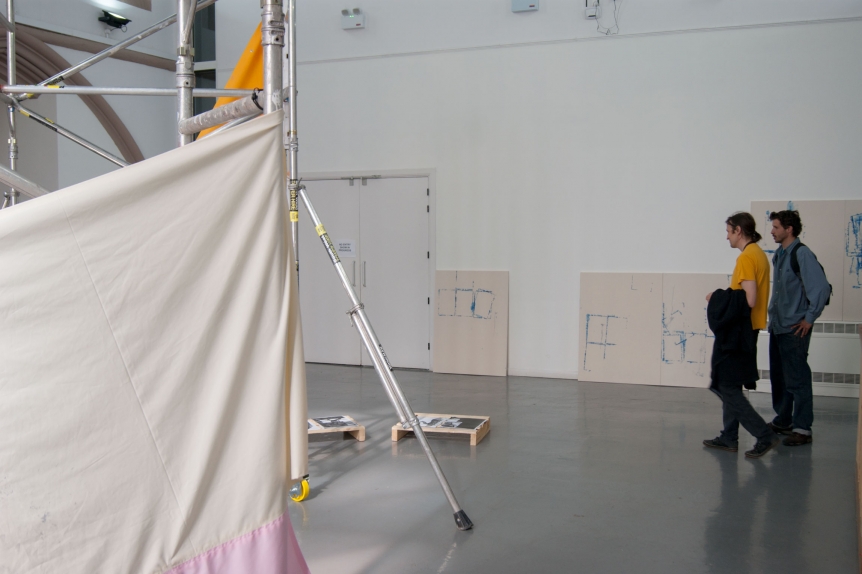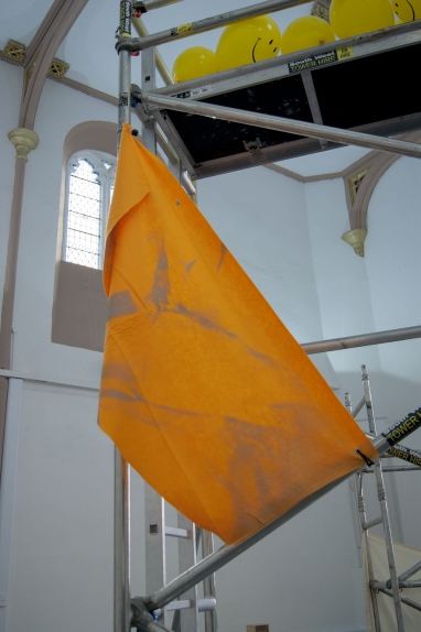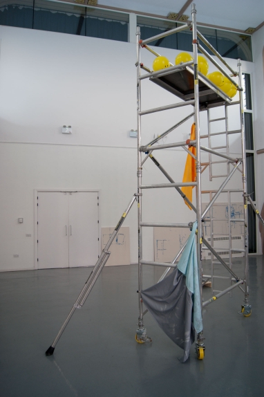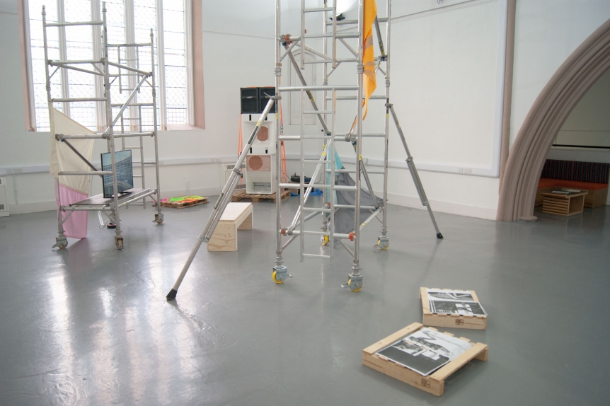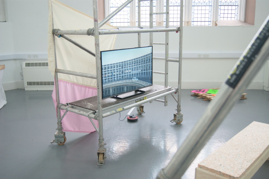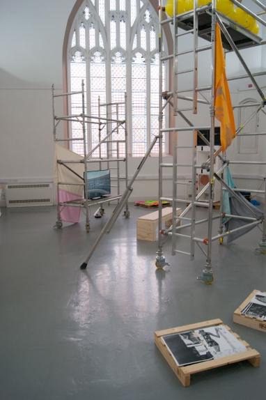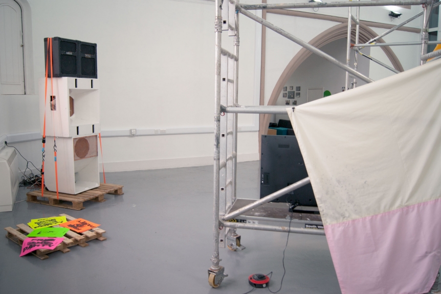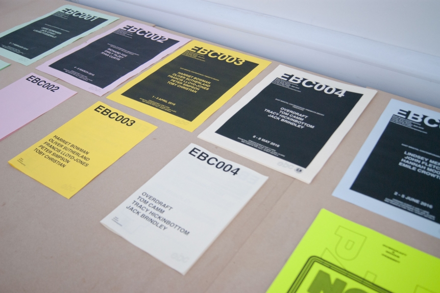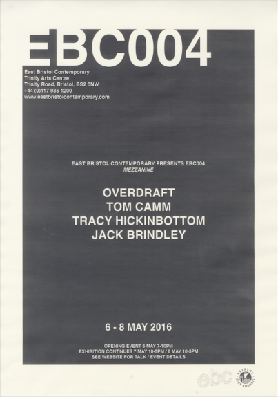 ebc004:mezzanine featured paintings by jack (london), fabric and print by tracy (birmingham), moving image by tom (london) and a sound system and balloons by overdraft (bristol). all of the works responded to the presence of two large scaffolding units that were brought into the gallery space. in addition, ebc004:mezzanine included a quiz organised by tom as well as a live radio stream and dj set by overdraft and their friends; noods.