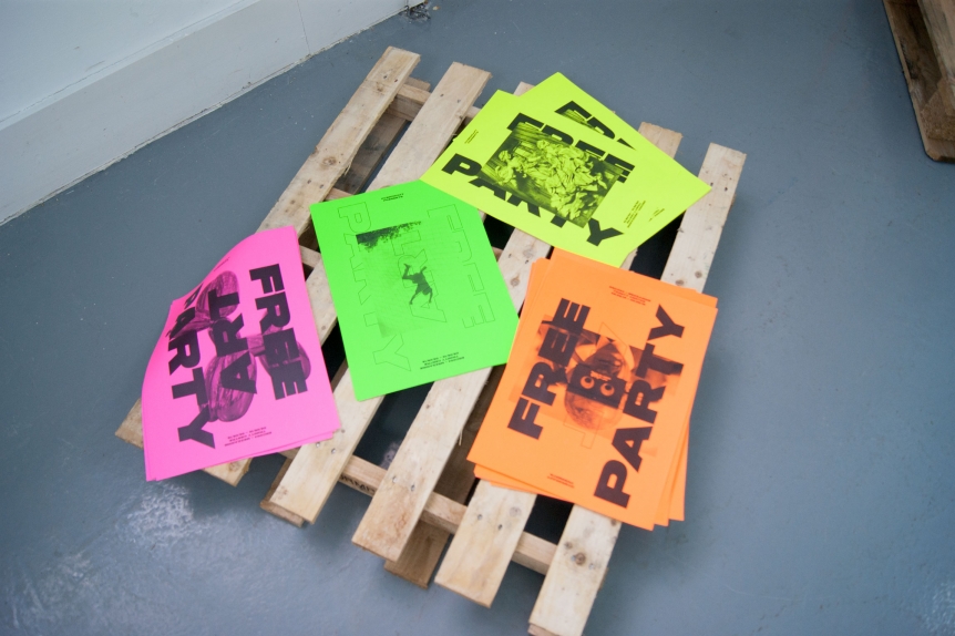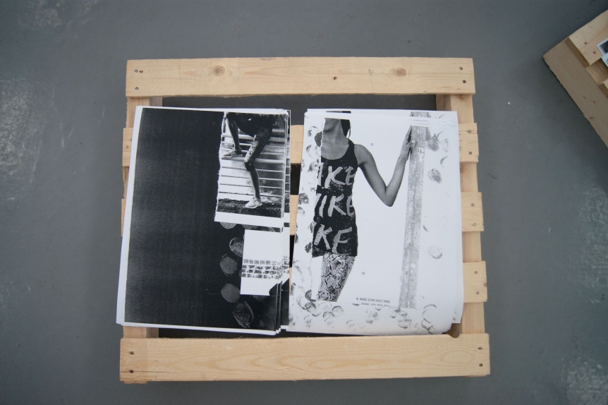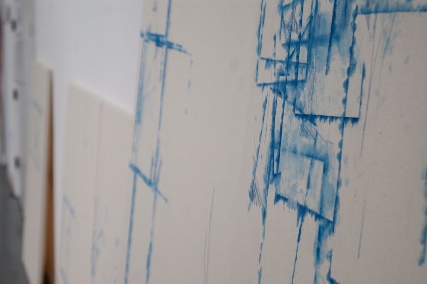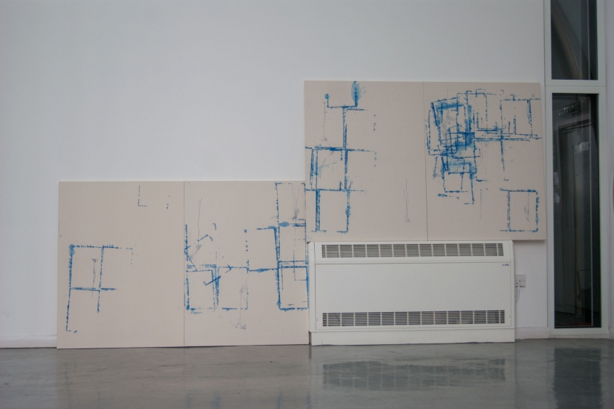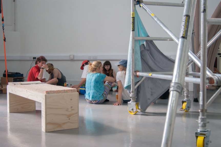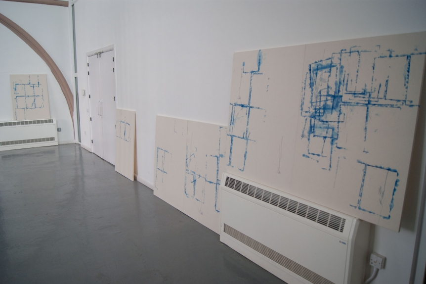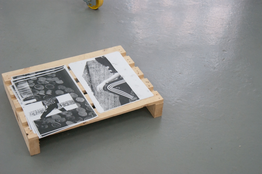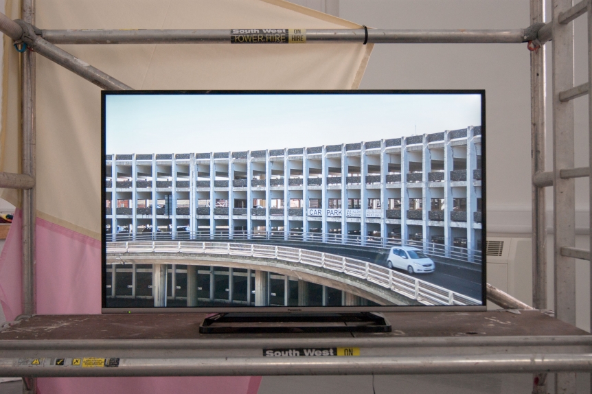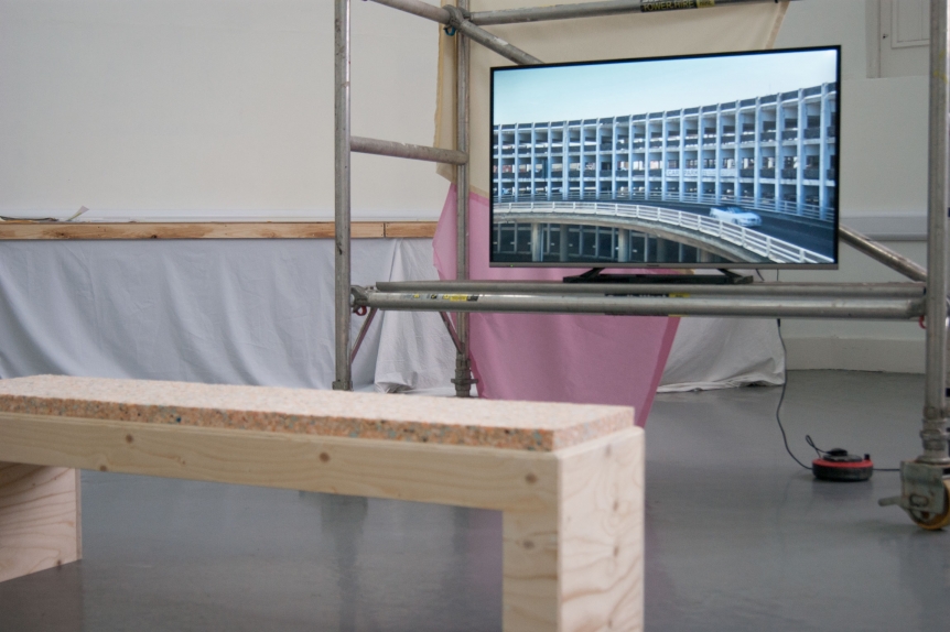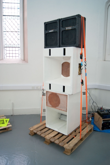 ebc004:mezzanine featured paintings by jack (london), fabric and print by tracy (birmingham), moving image by tom (london) and a sound system and balloons by overdraft (bristol). all of the works responded to the presence of two large scaffolding units that were brought into the gallery space. in addition, ebc004:mezzanine included a quiz organised by tom as well as a live radio stream and dj set by overdraft and their friends; noods.