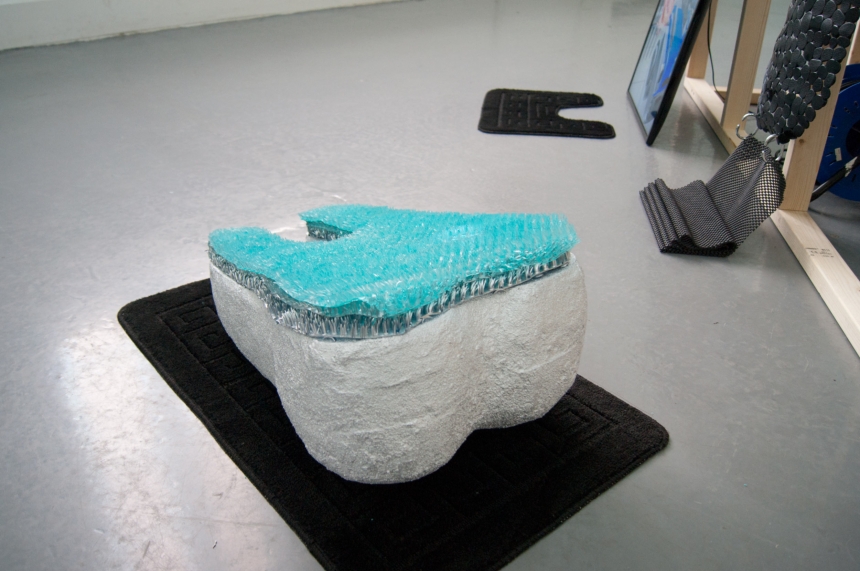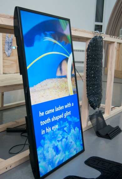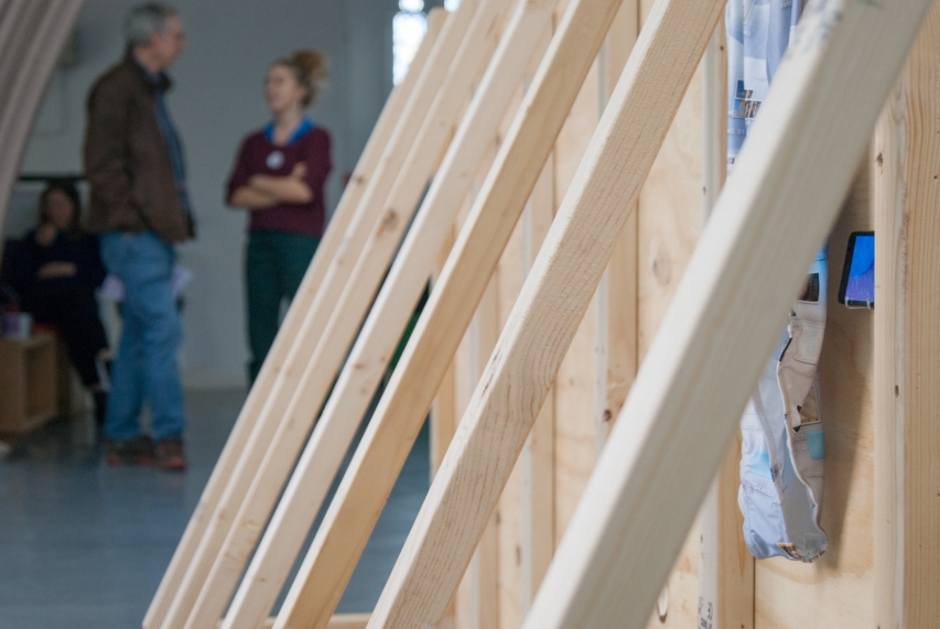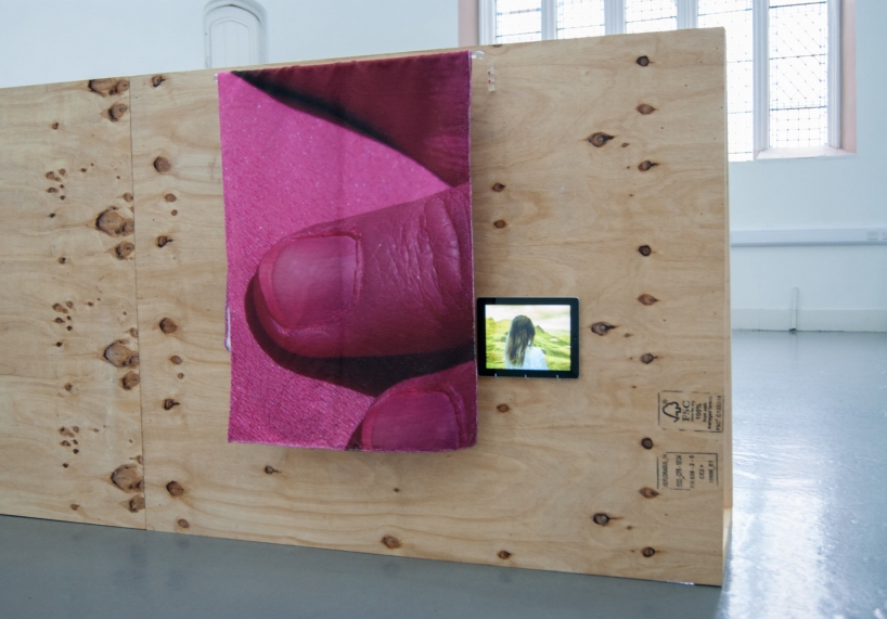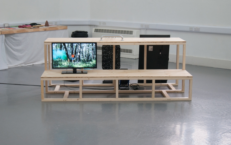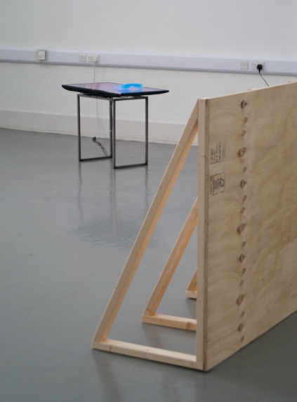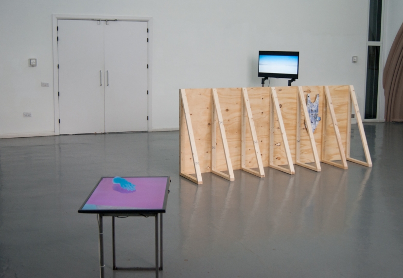 a gruesome twosome, ebc008 was ebc’s first two person show. the exhibition included video and scluptural work focussing on advertising and the digital world by hazel (london) and daniella (glasgow) as well as featuring fabricated wooden structures introduced by ebc. the exhibition opening included additional films projected by daniella, and a specially created 3d mapped projection by hazel on the ceiling of the gallery. the exhibition also included an artist talk/tour as part of its programme.