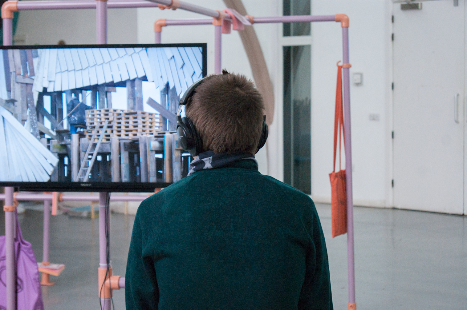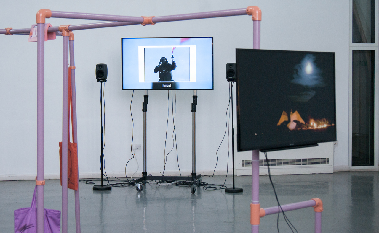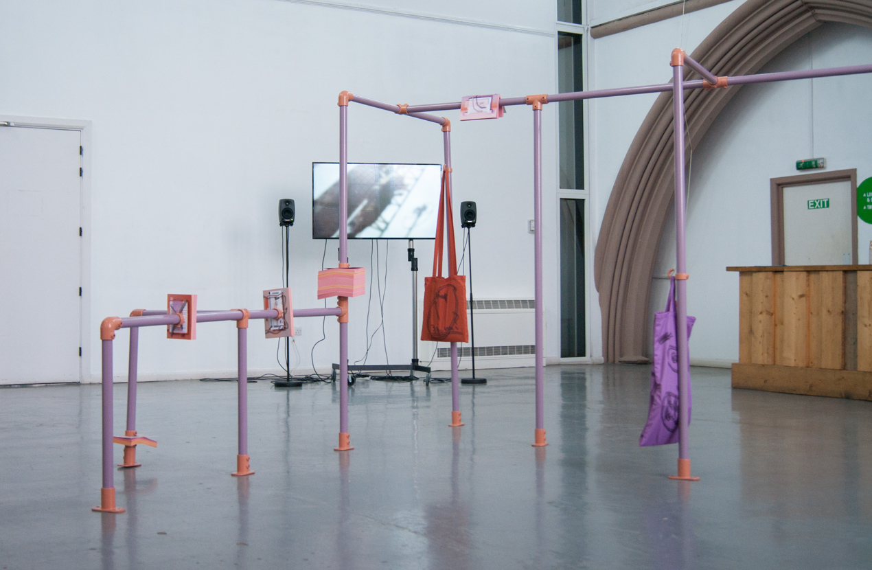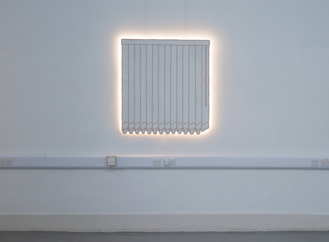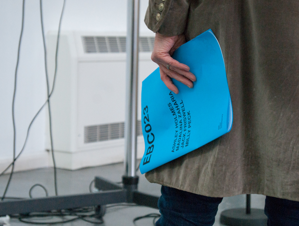 ebc023 featured ashley (sheffield), jack (bristol), and madalina and milly (london). the exhibition explored notions of knowledge, libraries, and forms of documentary. madalina presented a large structure in the centre of the space which referenced both libraries and her own collection of books. the structure also hosted jack’s film, which documented the building of a large wooden pigeon by the inhabitants of a seaside town, an effigy that is subsequently burned. ashley showed a video work that cuts together found footage from youtube clips of various musical performances and song recordings focussing particularly on black and minority ethnic artists. whilst milly showed a selection of new 2d works that represent blinds or curtains that are artificially lit from behind, giving the illusion of daylight entering into the gallery space.