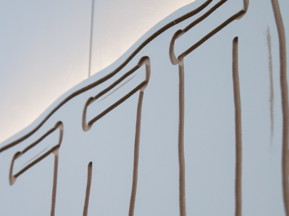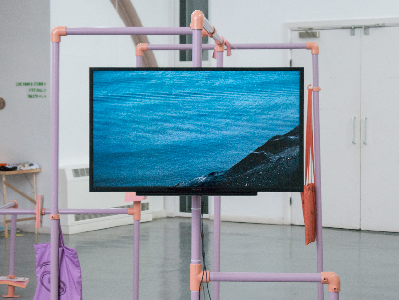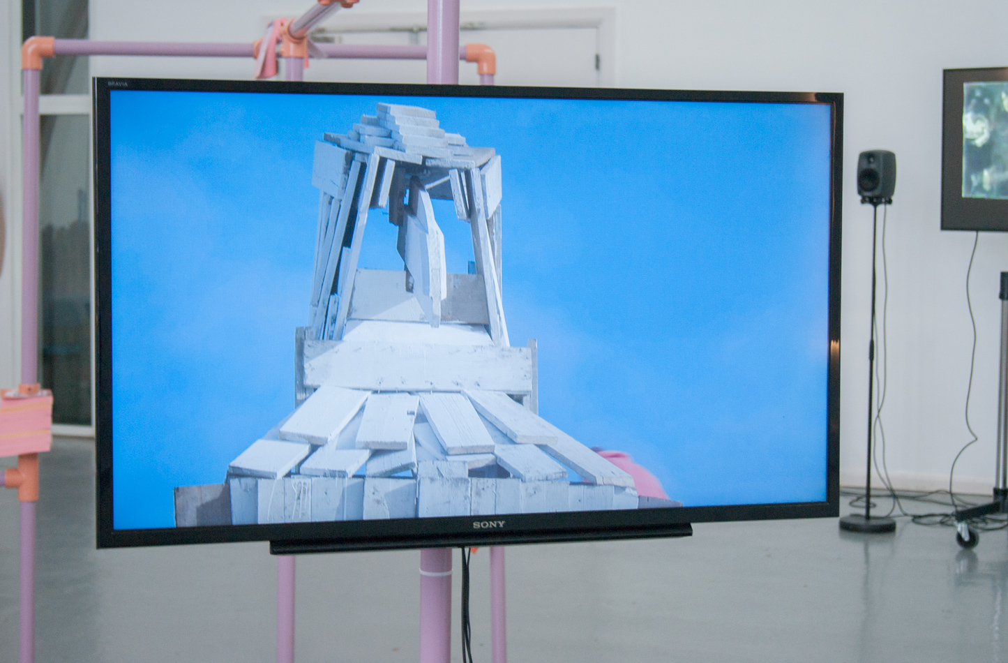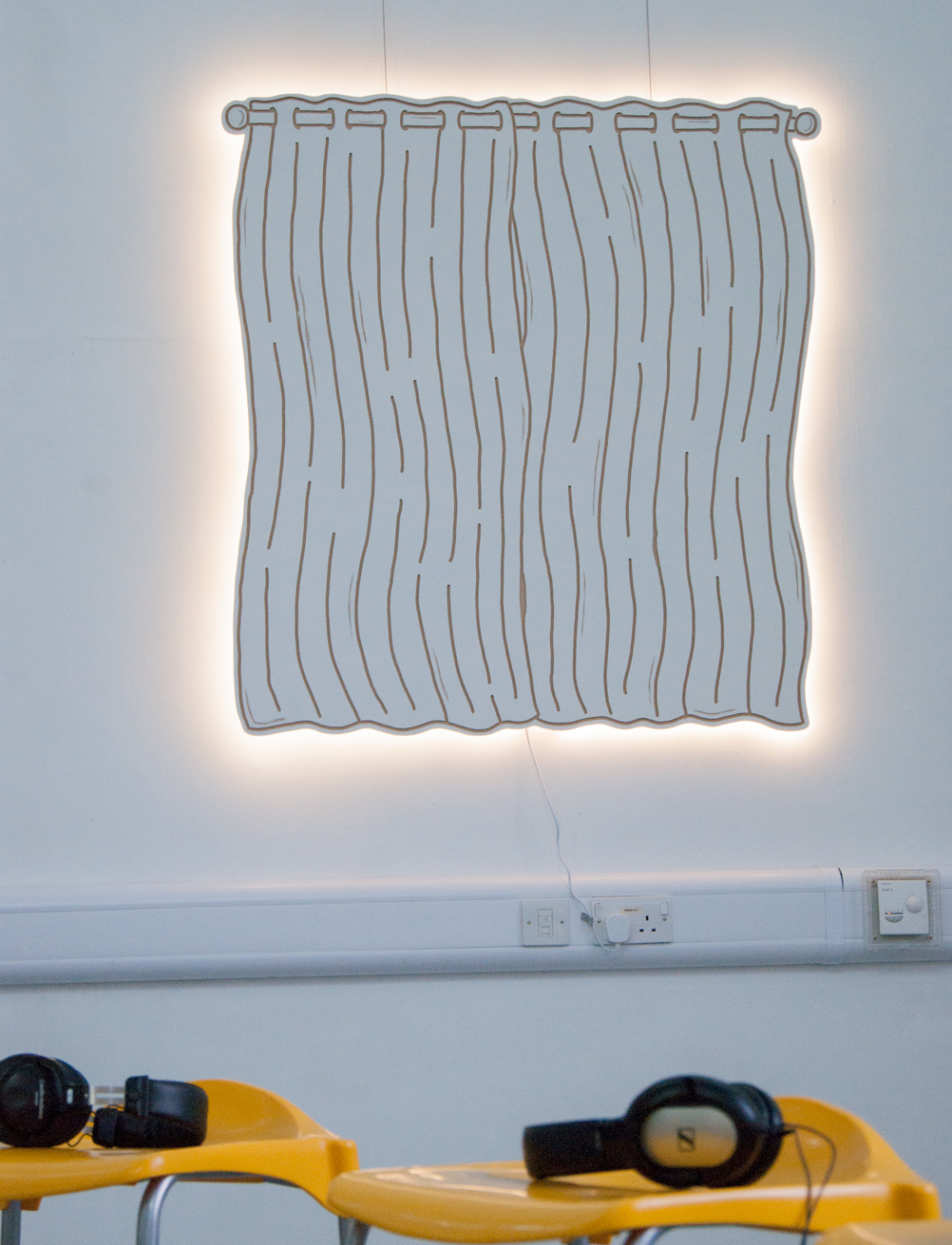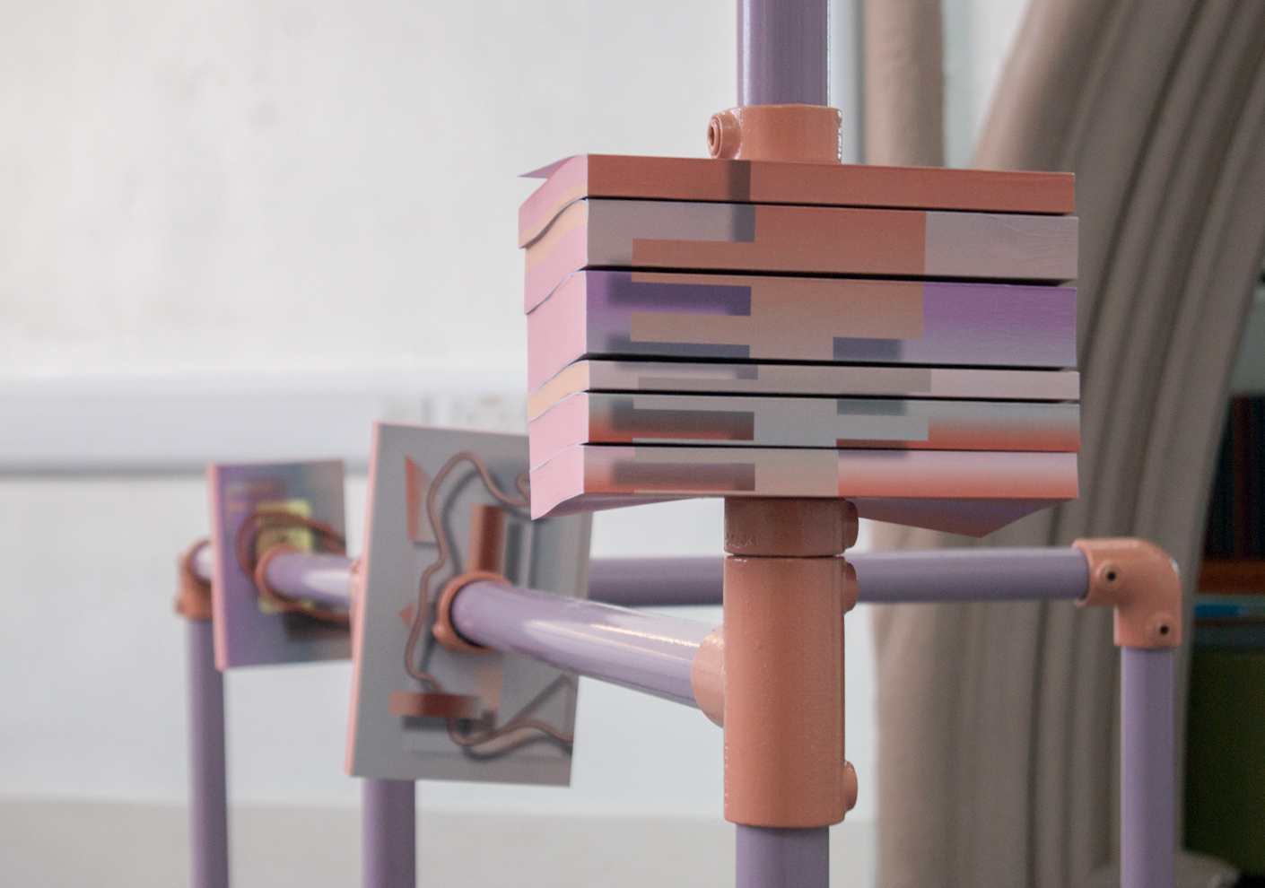 ebc023 featured ashley (sheffield), jack (bristol), and madalina and milly (london). the exhibition explored notions of knowledge, libraries, and forms of documentary. madalina presented a large structure in the centre of the space which referenced both libraries and her own collection of books. the structure also hosted jack’s film, which documented the building of a large wooden pigeon by the inhabitants of a seaside town, an effigy that is subsequently burned. ashley showed a video work that cuts together found footage from youtube clips of various musical performances and song recordings focussing particularly on black and minority ethnic artists. whilst milly showed a selection of new 2d works that represent blinds or curtains that are artificially lit from behind, giving the illusion of daylight entering into the gallery space.