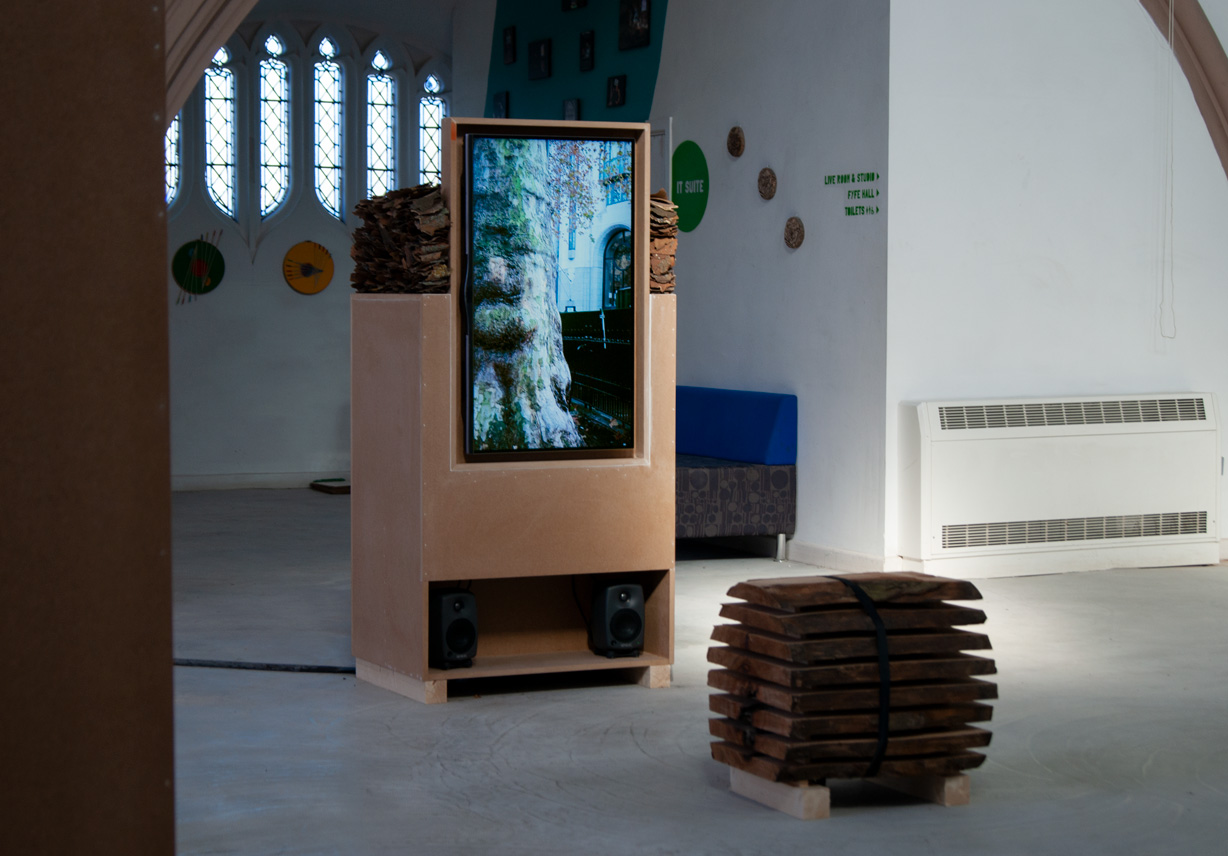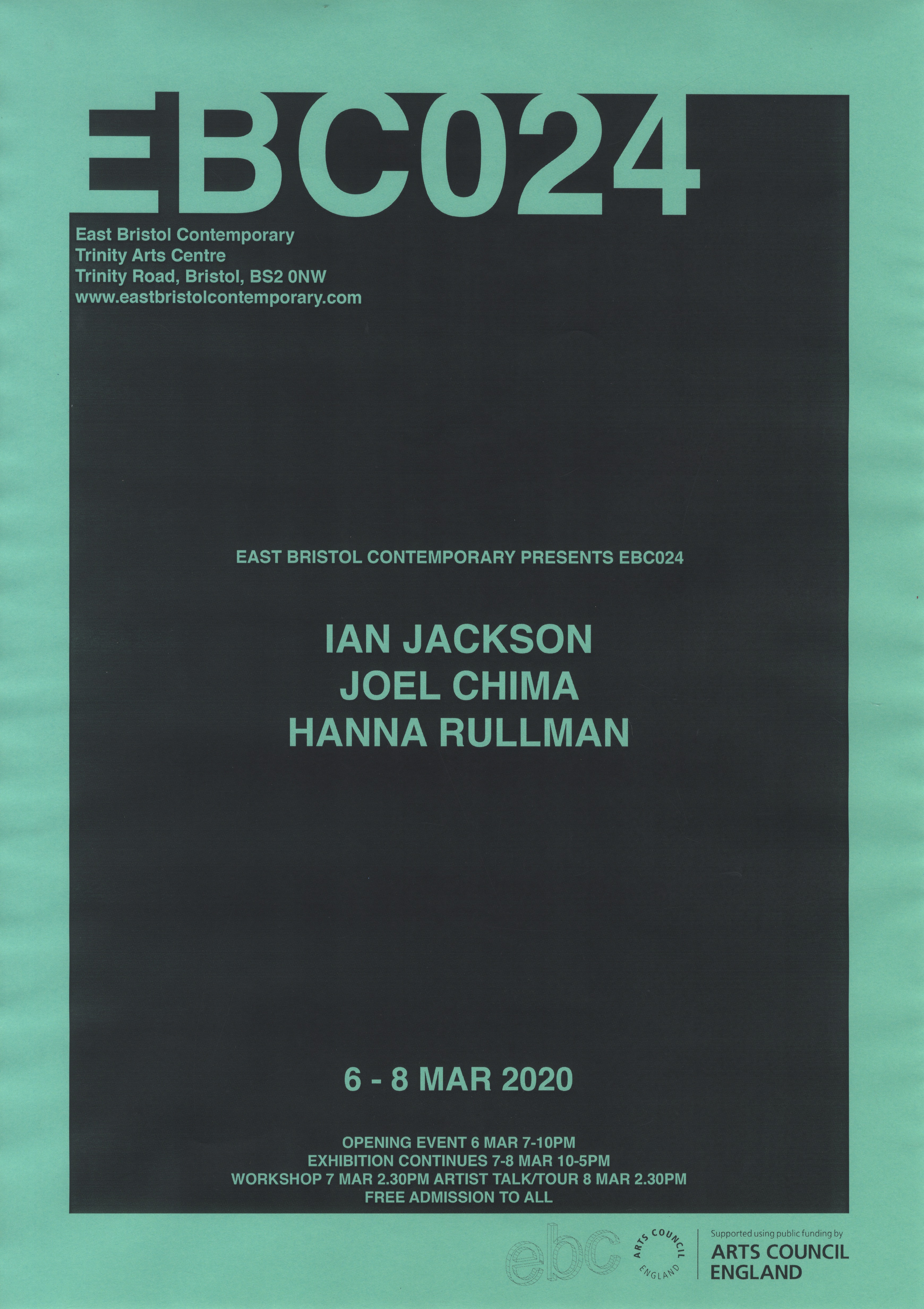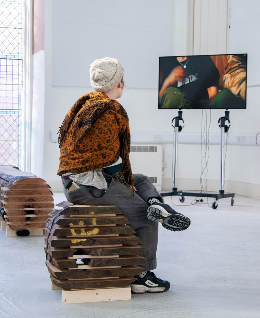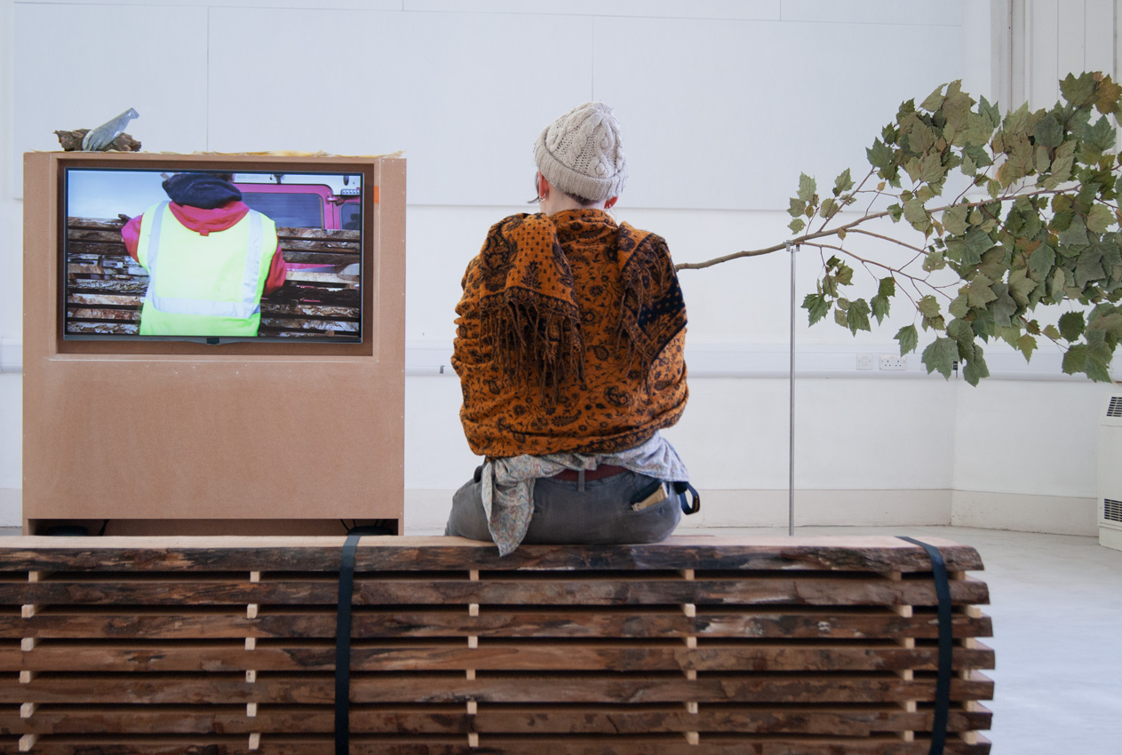 ebc024 featured ian (leeds), joel (calais/bristol), and hanna & faiza (london). the exhibition explored themes of reconfiguration, potential and change. ian presented several works that centred around the use of plane trees in public spaces, particularly in london, and his acquisition of one such tree that was subsequently cut and presented in the exhibition for use as seating. joel presented a film called no fixed aboad which focusses on the lives of people that he had spent time with and interviewed, all of the interviewees could be considered to live alternative or outsider lifestyles. hanna also presented a film work which documented the building of a nature reserve on the site of the former ‘jungle’ in calais, alongside some printed letters and documents of research.