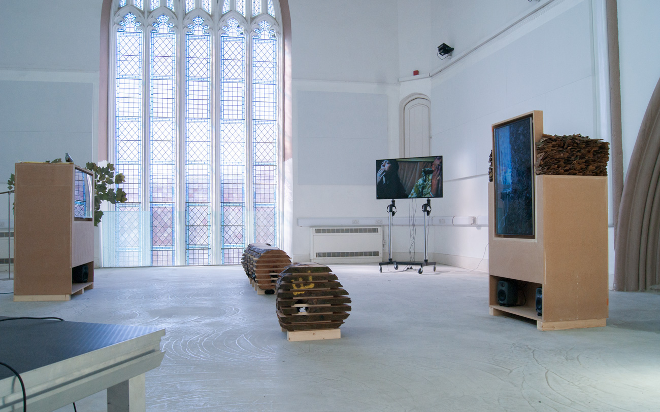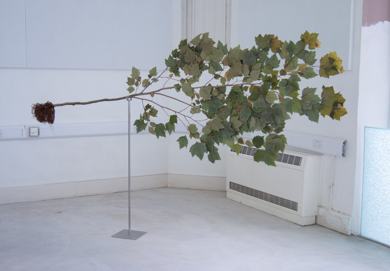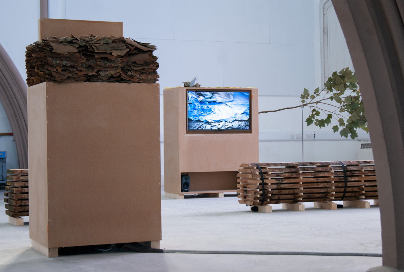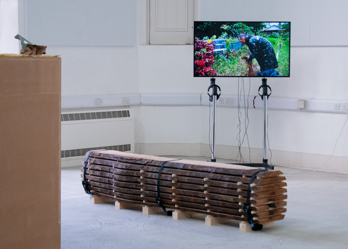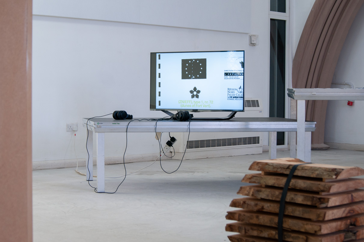 ebc024 featured ian (leeds), joel (calais/bristol), and hanna & faiza (london). the exhibition explored themes of reconfiguration, potential and change. ian presented several works that centred around the use of plane trees in public spaces, particularly in london, and his acquisition of one such tree that was subsequently cut and presented in the exhibition for use as seating. joel presented a film called no fixed aboad which focusses on the lives of people that he had spent time with and interviewed, all of the interviewees could be considered to live alternative or outsider lifestyles. hanna also presented a film work which documented the building of a nature reserve on the site of the former ‘jungle’ in calais, alongside some printed letters and documents of research.
